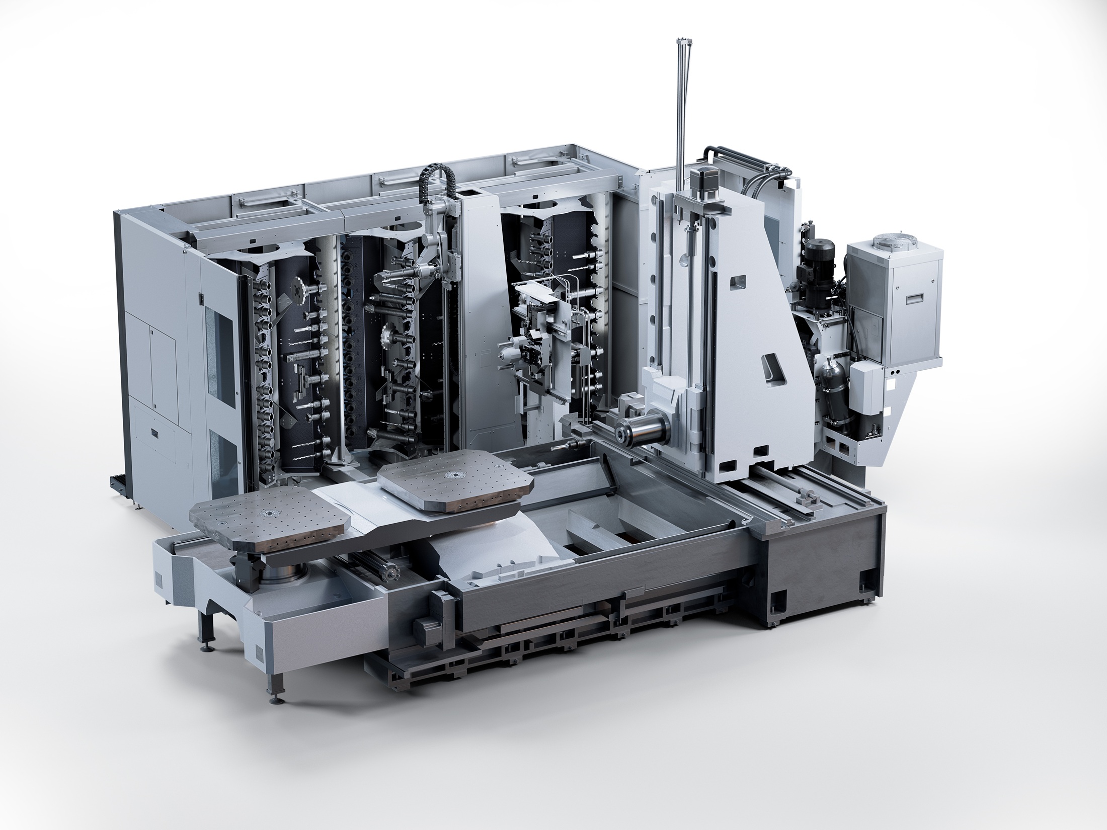This also applies to the Heckert H100, which has dimensions of 8,900 by 4,600 mm and enables travel paths of 1,750 by 1,300 by 1,400 mm in the X, Y and Z axes. As an option, the Y-axis travel can be extended up to 1,400 mm, and the Z-axis travel up to 1,800 mm. The displacement circle diameter is 2,000 mm.